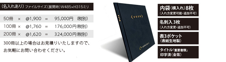 この度は、当サイトへお越しいただきありがとうございます。当サイトは、重要書類ファイルの専門店です。大切な重要書類や契約書類などの長期保存に適した仕様で、お客さまがご希望する多種多様なオリジナルファイルへの対応が可能です。日本全国の会社様への豊富な実績もございます。また実物見本も無料でお送り致しますので併せてお申し付け下さい!不明な点がありましたらお気軽にお問い合せ下さいませ。